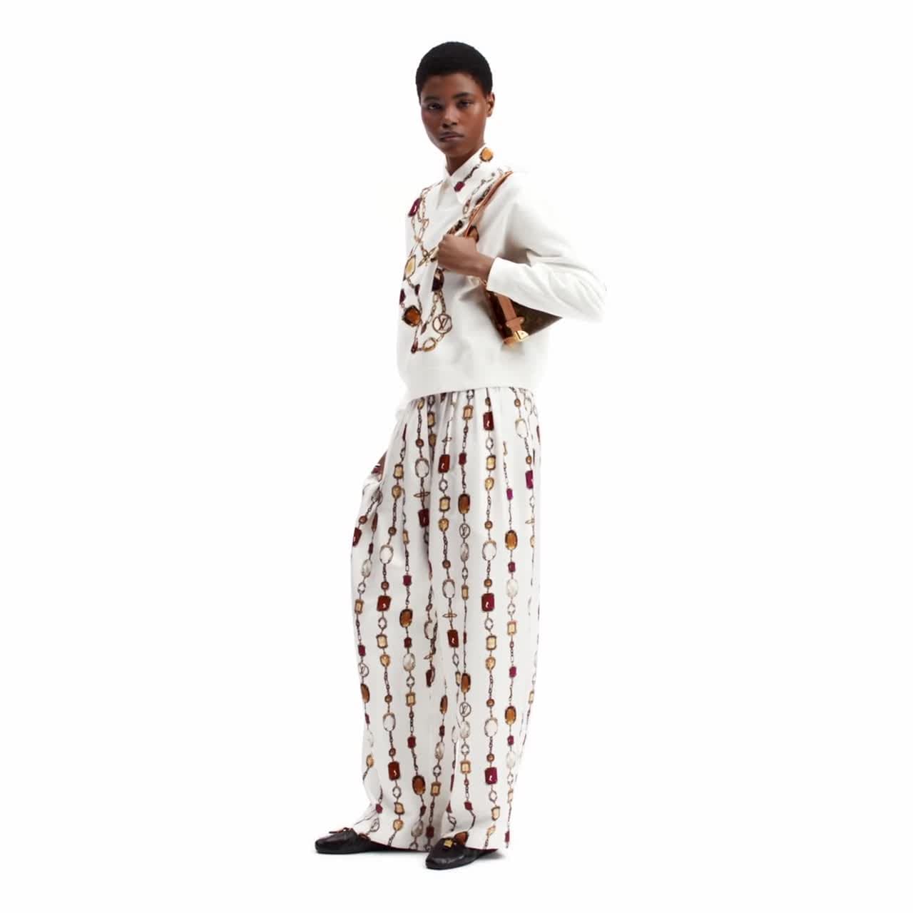 El emblemático pantalón tipo pijama de la Maison se reinterpreta esta temporada con un llamativo estampado de collares que combina los elegantes charms de Louis Vuitton con piedras preciosas en tonos intensos. La pieza, confeccionada en sarga de seda, presenta un corte relajado y una cintura elástica con cordón ajustable. El diseño se completa con un bolsillo de parche con botón que aporta un toque atemporal a la parte trasera.