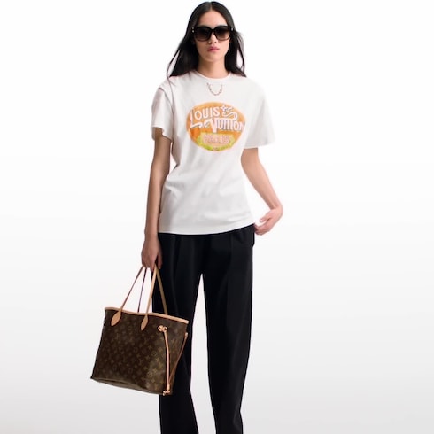 Esta playera, confeccionada en suave y fresco punto de algodón, aporta un toque llamativo a atuendos cotidianos. La prenda destaca por el colorido sello de viaje vintage oversize con el distintivo Louis Vuitton Paris en el pecho. Este modelo se completa con un moderno detalle de cadena LV en el cuello.