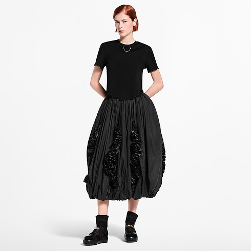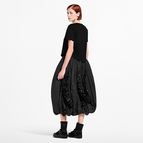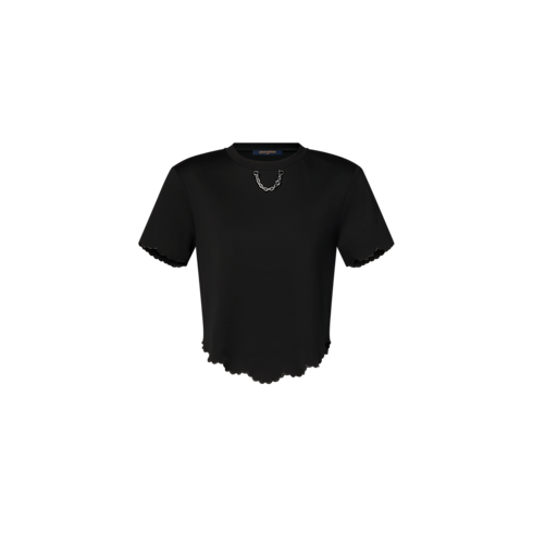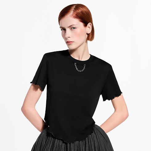Esta playera básica se renueva con bordes ondulados que le aportan un estilo moderno y alegre para el día a día. Está confeccionada en punto de algodón suave con un corte recto y corto y un bajo redondeado. El cuello redondo incluye un detalle de cadena LV que añade un toque distintivo y elegante.