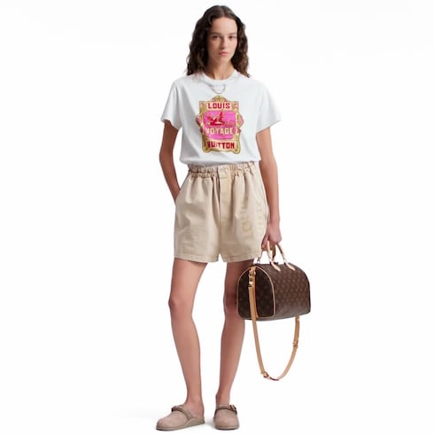Esta playera se realza con un colorido sello de viaje vintage en el pecho con diferentes motivos de la Maison y un loro. La pieza, confeccionada en suave punto de algodón, presenta un cómodo corte entallado de manga corta. El modelo se completa con un moderno detalle de cadena LV en el cuello.