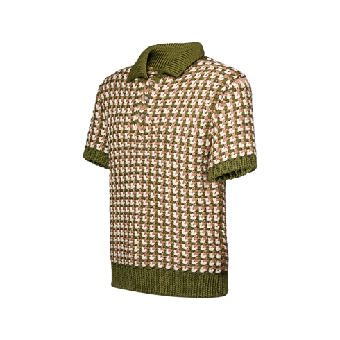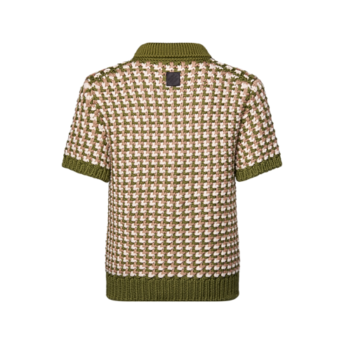 Esta polo del desfile Primavera-Verano 2026 retoma el estilo clásico de una pieza atemporal. El modelo está confeccionado en punto grueso de lana y luce el motivo gráfico LV Stitch en elegantes tonos verde y beige. La prenda presenta un parche distintivo de piel en la espalda y es ideal para usarse sobre una camisa y combinar colores y texturas.
