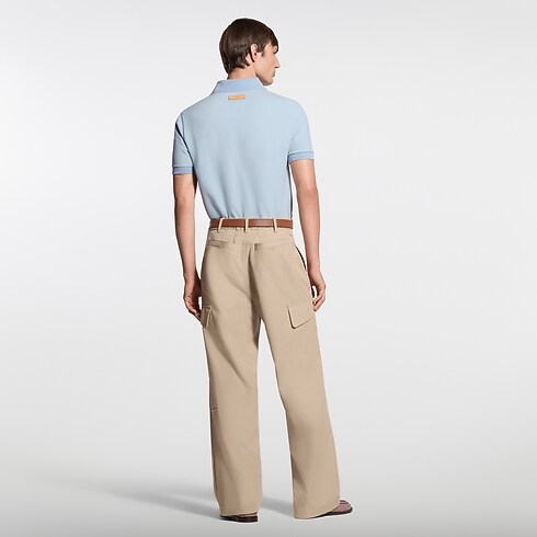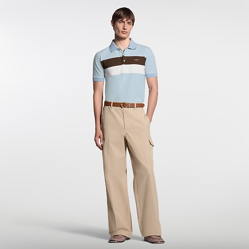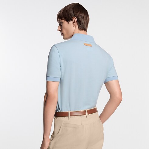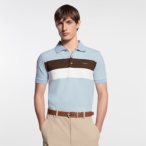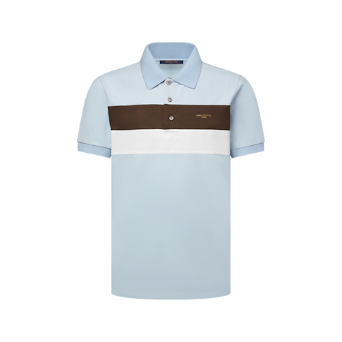 Esta elegante polo, confeccionada en piqué de algodón azul claro, se realza con bandas horizontales de color café y blanco a contraste en el pecho. El modelo presenta los distintivos Louis Vuitton Paris dorado en la parte delantera y «Marque L.Vuitton Déposée» en un parche en la parte trasera. La prenda de estilo universitario aporta un toque elegante a cualquier atuendo.