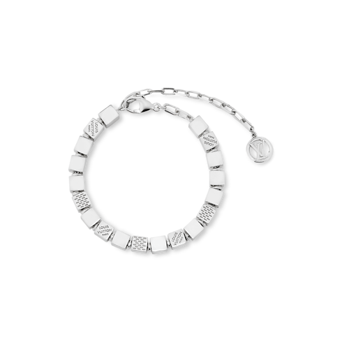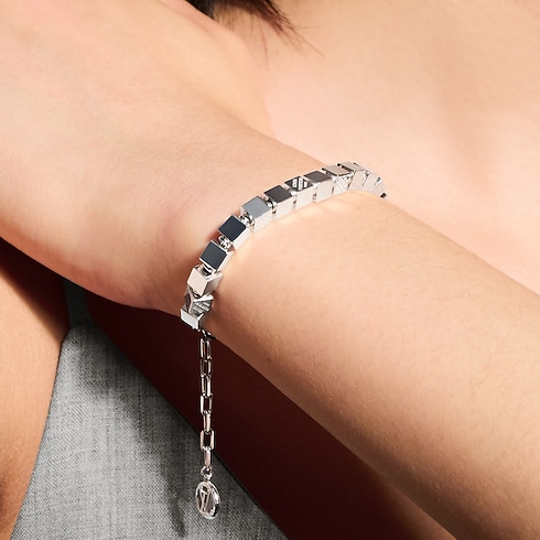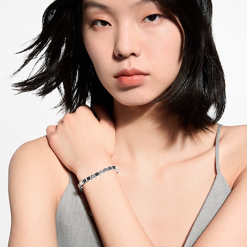 La pulsera LV Cube se inspira en un ícono de la historia de la Maison: Pateki, un juego creado por Gaston Vuitton en 1932. El modelo presenta eslabones en forma de cubos, grabados con líneas que evocan el emblemático patrón Damier. Esta pieza, ideal para complementar cualquier atuendo, se completa con el distintivo Louis Vuitton Paris.