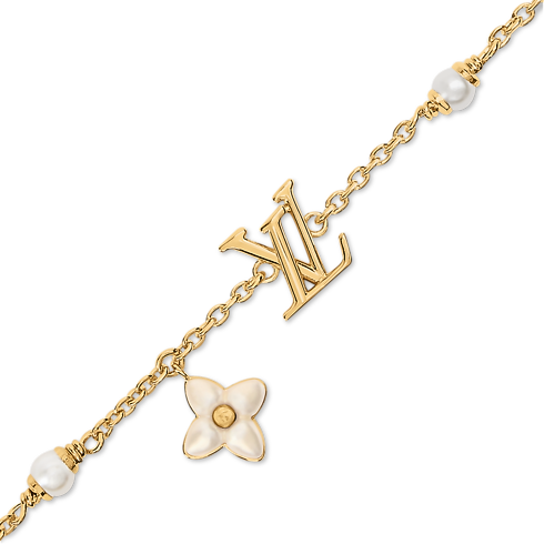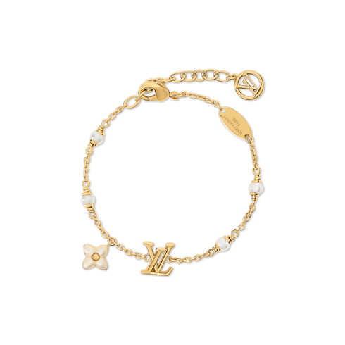 La pulsera LV Floragram XS rinde homenaje a la belleza y el simbolismo de la perla. El modelo, elaborado en metal dorado, incorpora un delicado charm de iniciales LV y una flor Monograma con resina blanca nacarada. La pieza se completa con cuatro perlas de resina que aportan un sutil toque de glamour.
