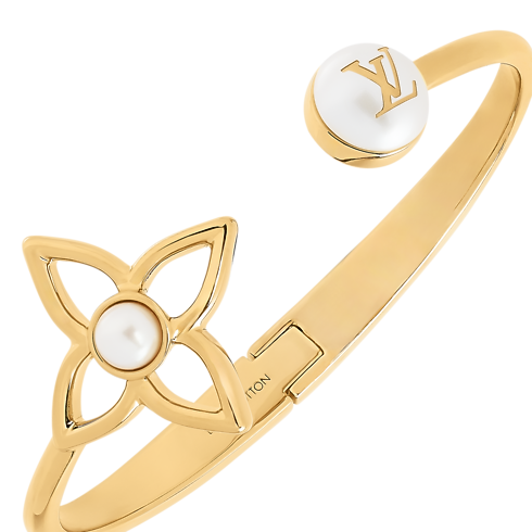 Esta pulsera Pearly Flower combina el clásico motivo Monograma con el simbolismo de las perlas. El modelo está confeccionado en metal de color dorado y luce una flor Monograma calada y dos perlas de resina, una de ellas decorada con las iniciales LV, que le añaden un toque adicional de la Maison. Esta femenina pieza es ideal para lucir en cualquier ocasión.