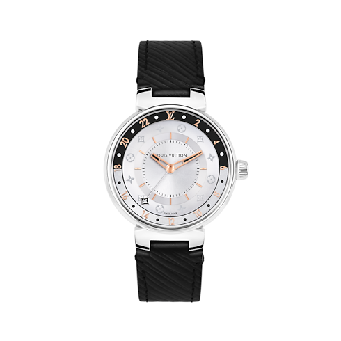 El femenino y refinado reloj Tambour Moon Dual Time blanco y negro es una representación contemporánea del espíritu viajero. Presenta un indicador de 24 horas que muestra tanto la hora local como la hora del lugar de origen. La llamativa esfera luce unas Monogram Flowers estampadas y cuenta con una aguja GMT en forma de Monogram Flower, que evoca el legado de Louis Vuitton. El diseño cóncavo de la esfera y su superficie cepillada con efecto rayo de sol crean unos sutiles juegos de luces.