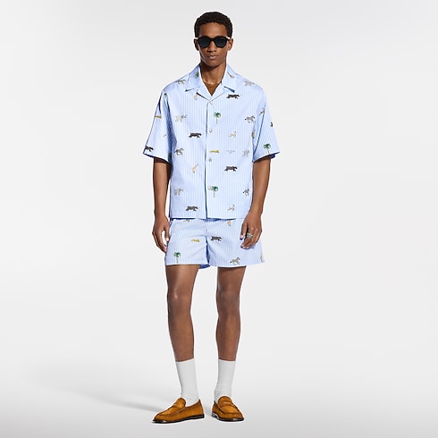 Estos shorts a rayas azul claro se realzan con el motivo Louis Vuitton x The Darjeeling Limited del desfile Primavera-Verano 2026. El modelo presenta emblemáticos diseños bordados en toda la prenda que rinden homenaje al arte de viajar, así como un sutil distintivo Louis Vuitton Paris en el bolsillo trasero. La prenda puede combinarse con la camisa de manga corta a juego para crear un fresco conjunto veraniego.