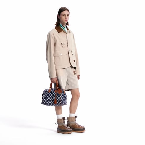 These hybrid workwear shorts are crafted with a beige Damier cotton piqué base adorned with sporty color-blocked nylon inserts on the outside of each leg and the patch pockets. A soft, ribbed drawstring waist is accented with gold-toned metal cord ends, while an LV Japan label is embroidered on the left pocket recalling this season’s collaboration with Japanese designer Nigo. A matching pullover makes a relaxed yet distinguished set.