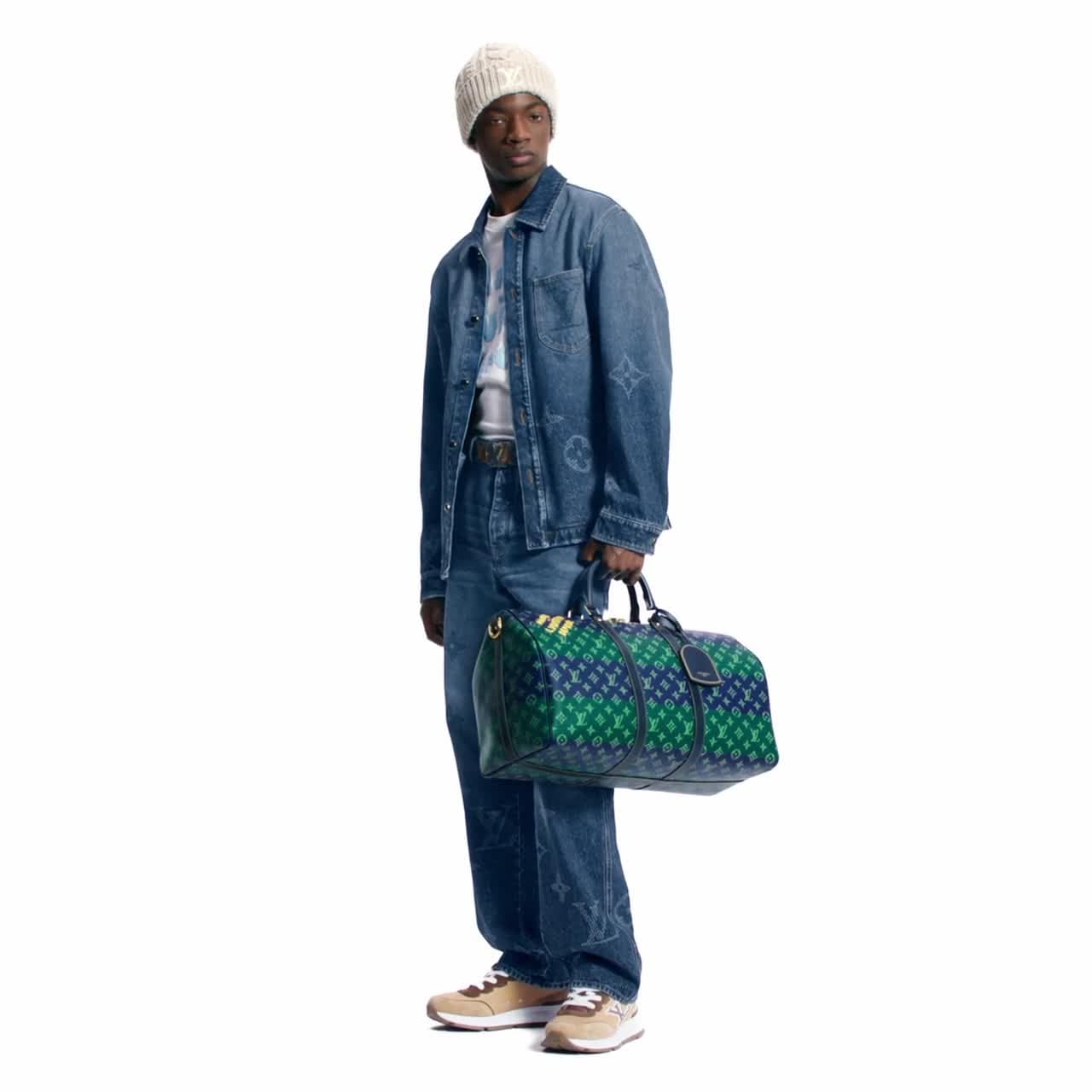 Esta sobrecamisa utilitaria está confeccionada en tejido denim orgánico con un acabado vintage lavado. La prenda de silueta holgada presenta un motivo Monograma Seeds con un efecto degradado tonal, dos bolsillos en la parte frontal y otro en el interior. Este diseño se completa con un parche en piel grabado en relieve en la parte posterior y puede combinarse con un pantalón a juego.