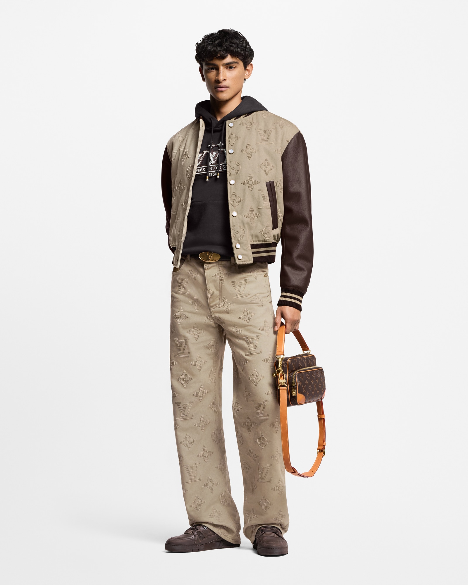 Esta imprescindible sudadera con capucha está confeccionada en algodón orgánico de elegante color café oscuro. La pieza luce el parche de la temporada con el logotipo LV Vers United, inspirado en el fútbol, bordado con perlas de resina en el pecho. Este versátil modelo de estilo informal se completa con extremos tipo joya en los cordones.