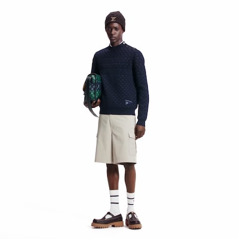 Este suéter, confeccionado en punto de lana merino certificada, luce el emblemático motivo Damier con un acabado texturizado. El modelo de color azul marino luce rayas horizontales en la parte superior y la bandera LV Pennant bordada sobre el bajo lateral izquierdo. La pieza se completa con elegantes botones de color negro con engastes en tono dorado en el hombro izquierdo.