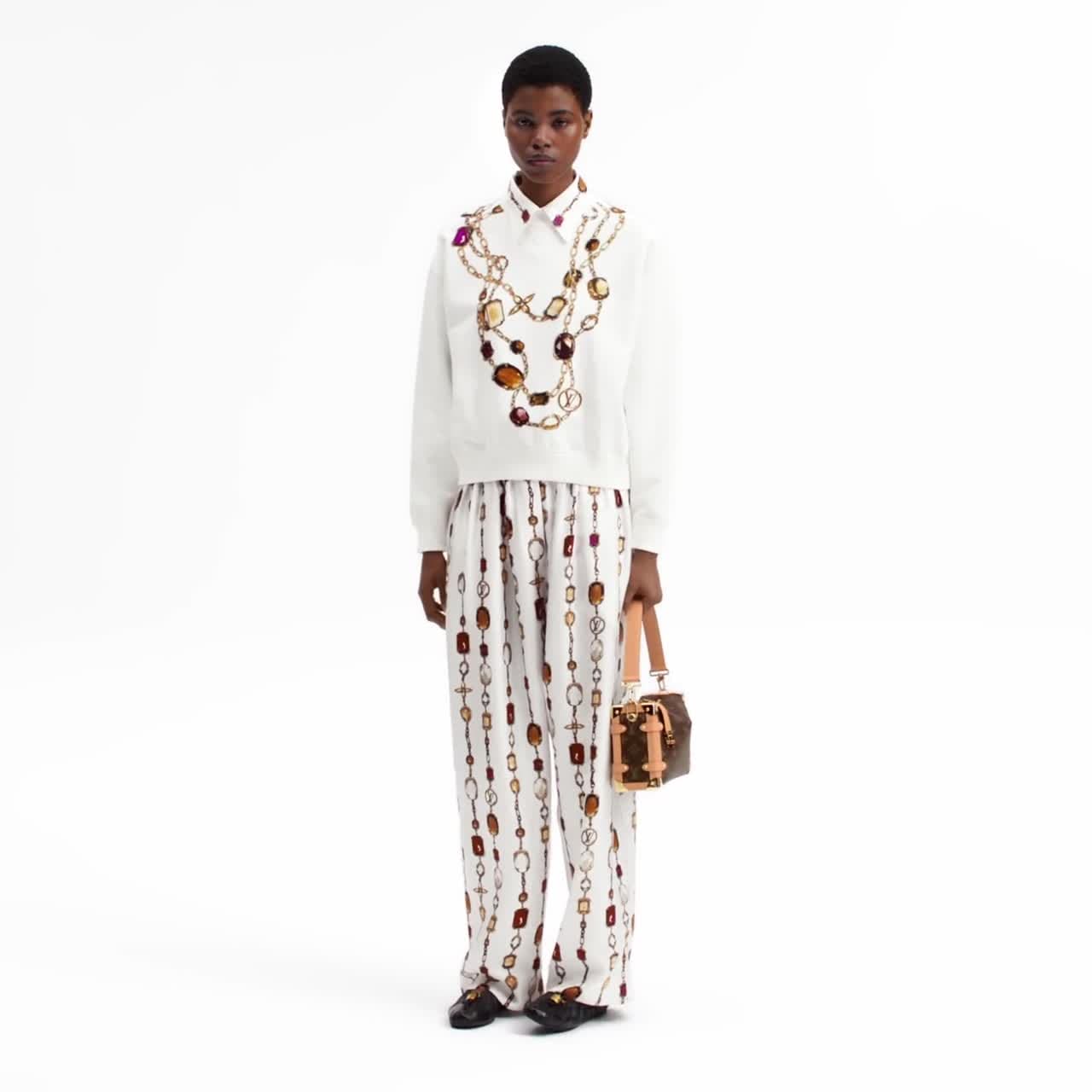 Este suéter presenta un elegante estampado oversize de un collar formado por detalles distintivos de la Maison combinados con brillantes gemas de colores alrededor del cuello para crear un efecto óptico. La pieza de corte amplio está confeccionada en punto de algodón afelpado. Este clásico diseño se completa con unos cómodos bajos acanalados.
