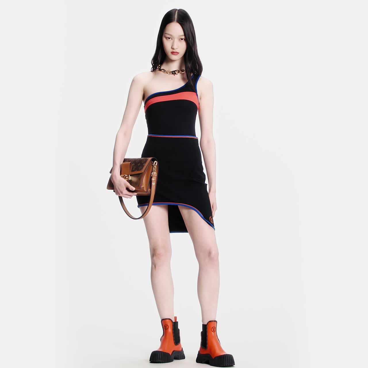 Este traje de baño presenta un corte asimétrico en un femenino estilo contemporáneo. El diseño luce llamativos tonos de temporada: un ribete en color azul y una inserción naranja en el pecho. La prenda incorpora detalles de la Maison, como el parche LV Circle de goma en la cadera.