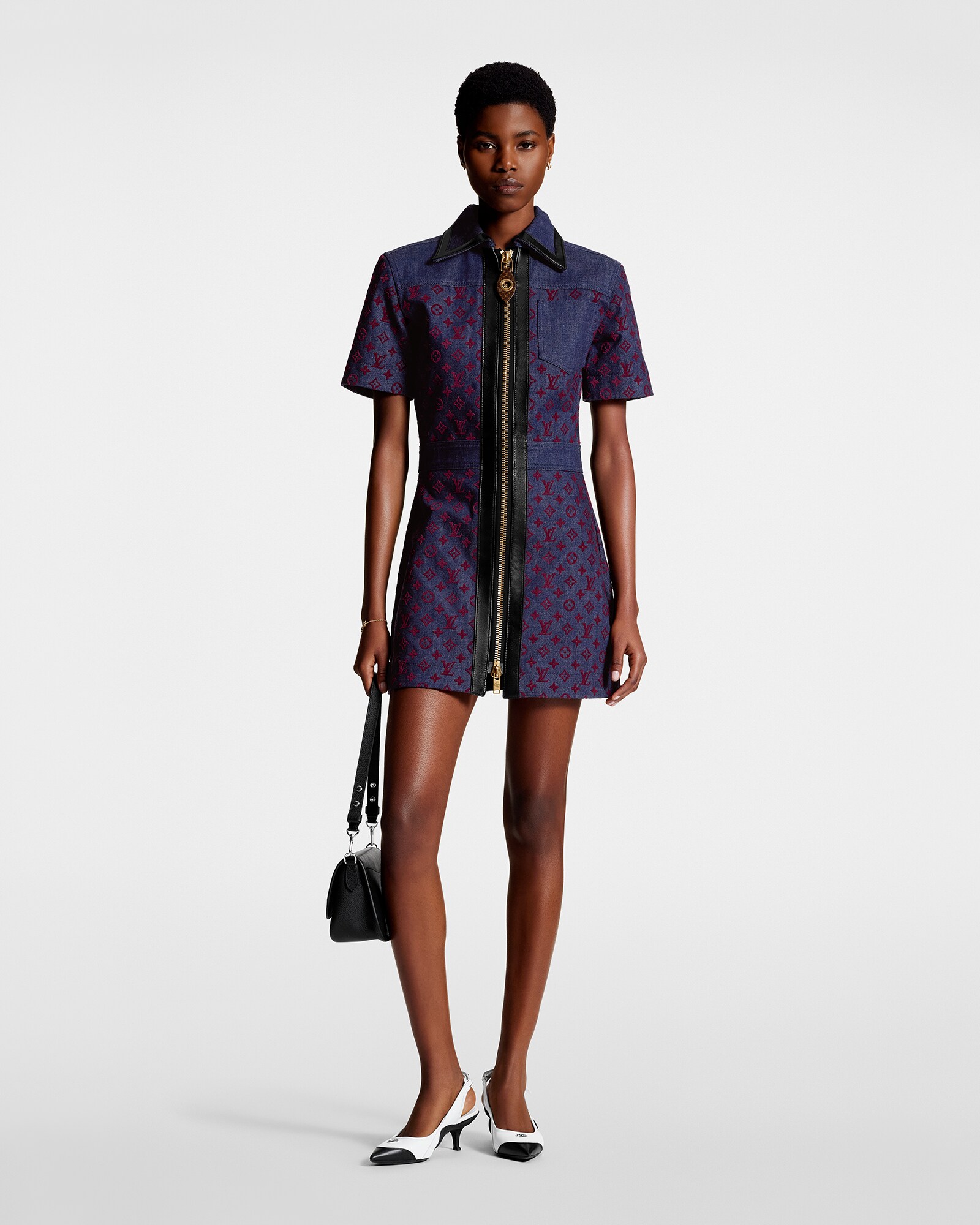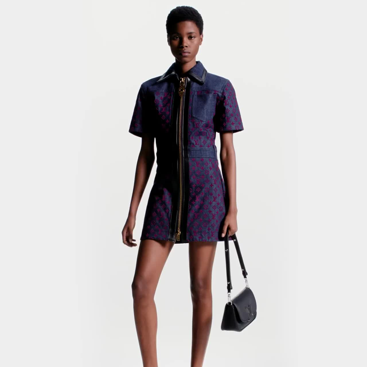Este vestido camisero de manga corta está confeccionado en resistente denim crudo en un clásico tono azul índigo y luce un corte acampanado. La pieza presenta el motivo Monograma gráfico con efecto flocado característico de la temporada. El modelo se completa con elegantes ribetes en piel y un moderno cierre doble expuesto en la parte frontal.