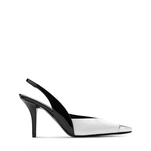 El zapato de salón destalonado Urban Twist está elaborado en piel de becerro brillante bicolor en un look gráfico y moderno. La pieza presenta una profunda abertura en V y una puntera plateada adornada con el logotipo LV Circle. Se completa con un tacón alto, mientras que una tira elástica en la parte trasera facilita el ajuste.