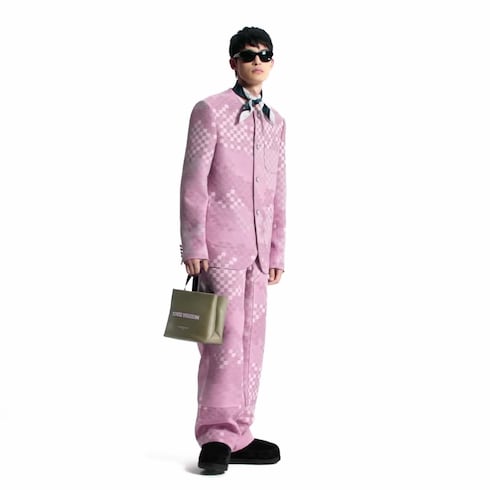 Jaket tanpa kerah ini terlihat elegan berhiaskan corak ikonis Damoflage Sakura warna pink dari peragaan busana koleksi Fall-Winter 2025. Desainnya menyajikan tema bunga sakura khas koleksi ini melalui bahan jacquard tweed dengan aksen benang warna pink bertekstur. Jaket ini dilengkapi lining berbahan sutra serta patch Marque L.Vuitton Déposée dari material kulit di bagian belakang, yang memberi sentuhan bergaya dandy pada tampilan di musim panas.